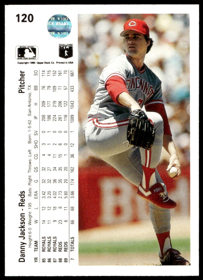 This BaseballΒ card, from 1990 is part of the Upper Deck Β card set. Danny Jackson is featured and has a card number of 120.