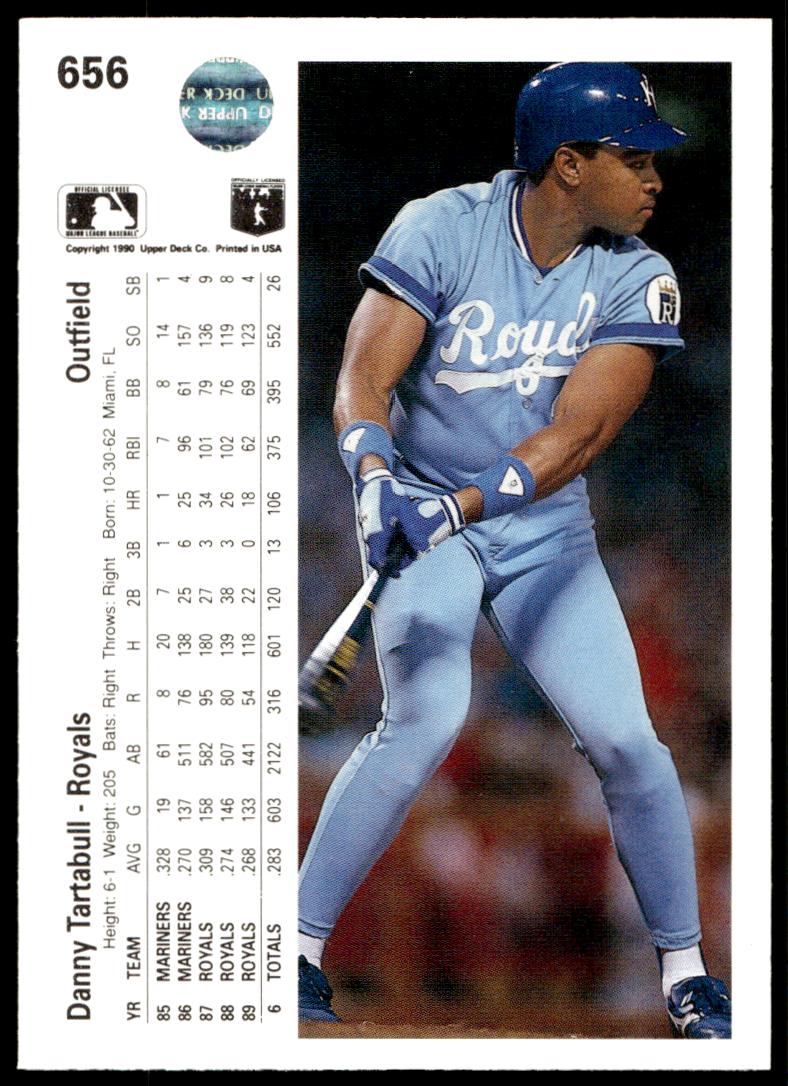 This BaseballΒ card, from 1990 is part of the Upper Deck Β card set. Danny Tartabull is featured and has a card number of 656.