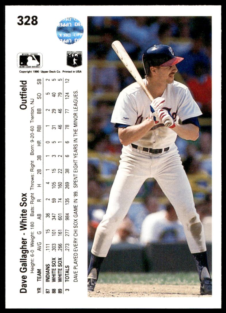 This BaseballΒ card, from 1990 is part of the Upper Deck Β card set. Dave Gallagher is featured and has a card number of 328.