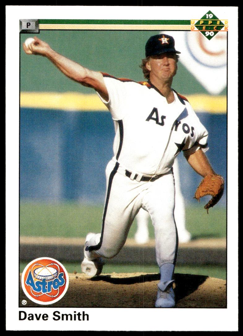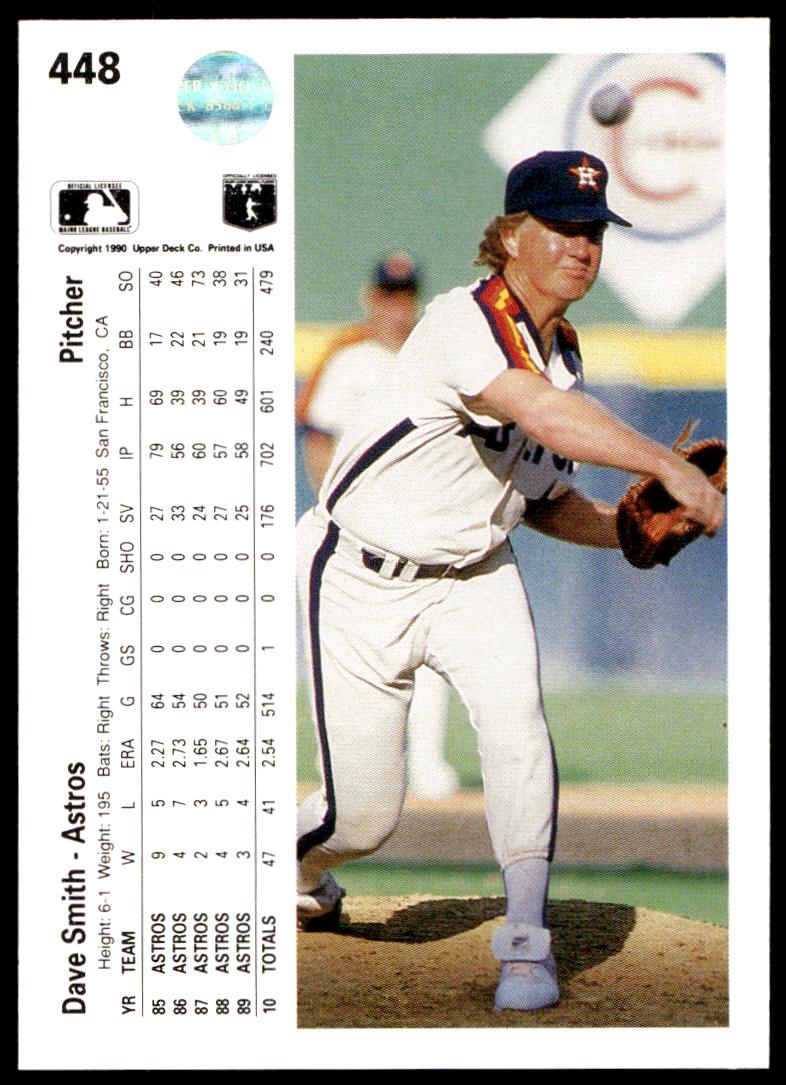 This Baseball card, from 1990 is part of the Upper Deck  card set. Dave Smith is featured and has a card number of 448.