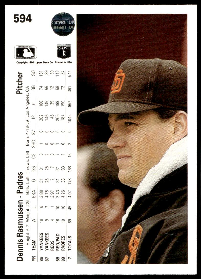 This BaseballΒ card, from 1990 is part of the Upper Deck Β card set. Dennis Rasmussen is featured and has a card number of 594.