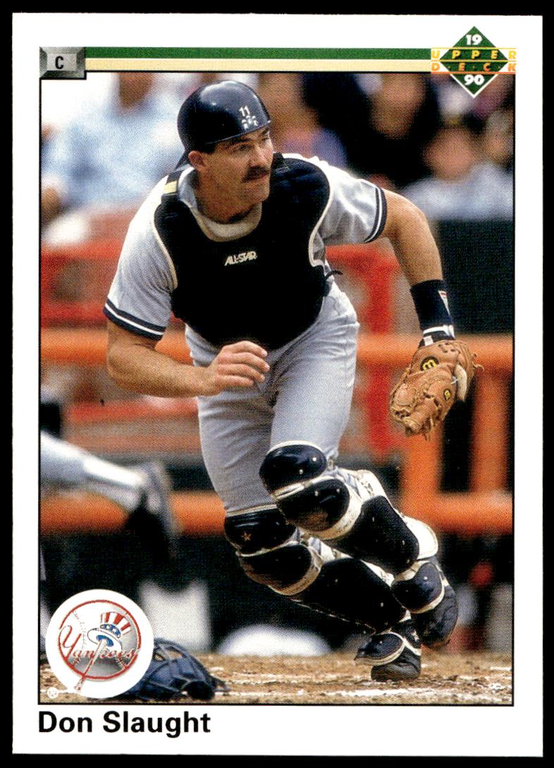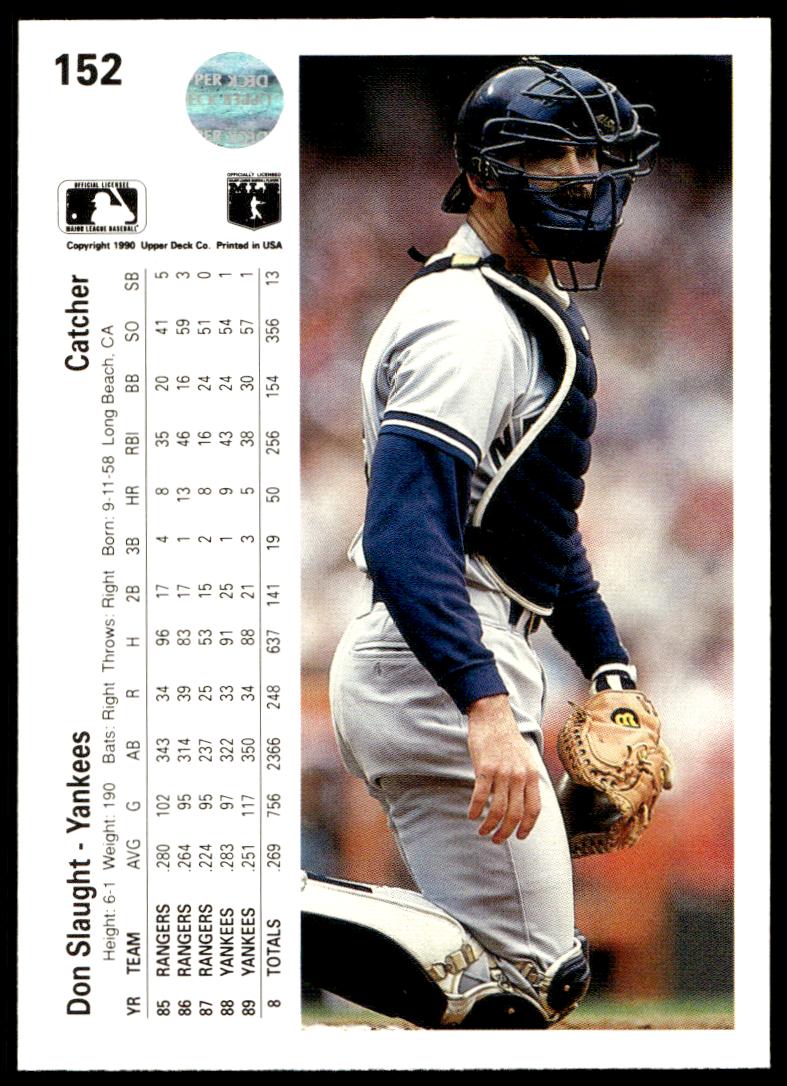 This Baseball card, from 1990 is part of the Upper Deck  card set. Don Slaught is featured and has a card number of 152.