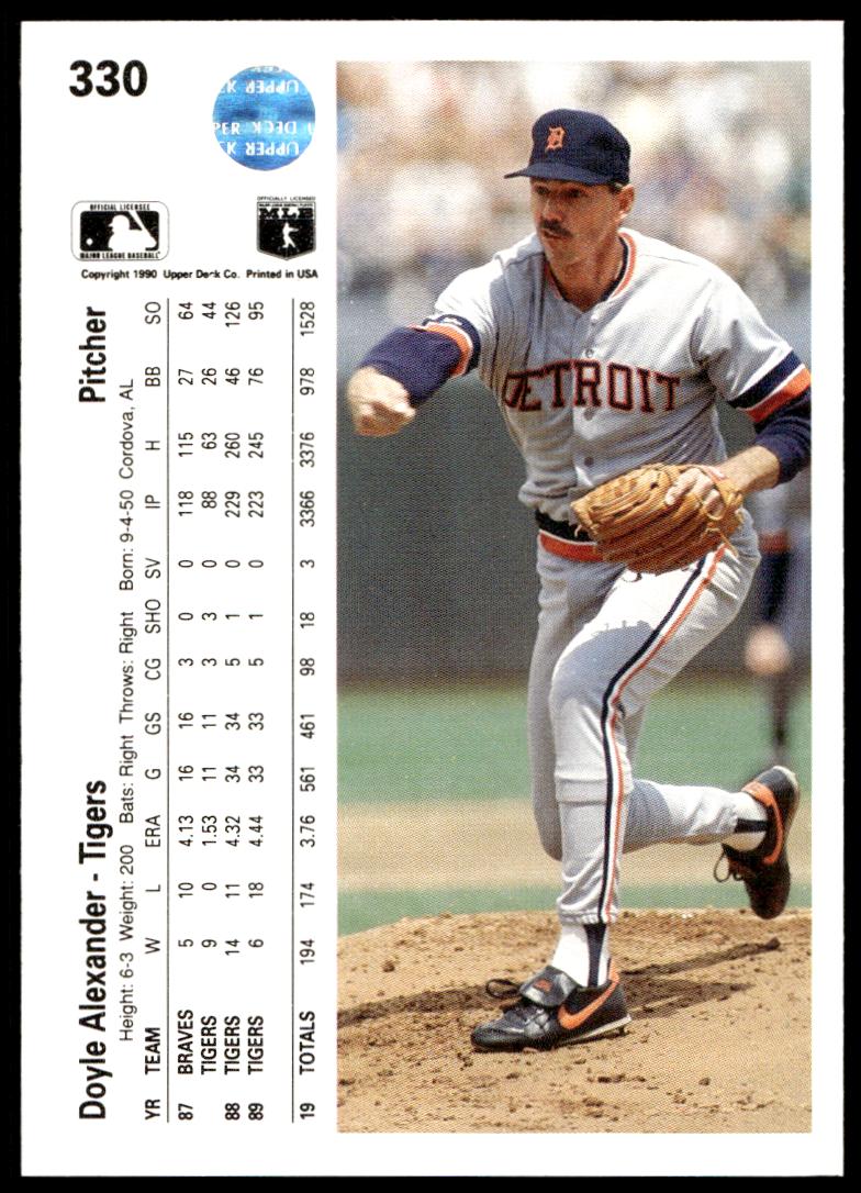 This BaseballΒ card, from 1990 is part of the Upper Deck Β card set. Doyle Alexander is featured and has a card number of 330.