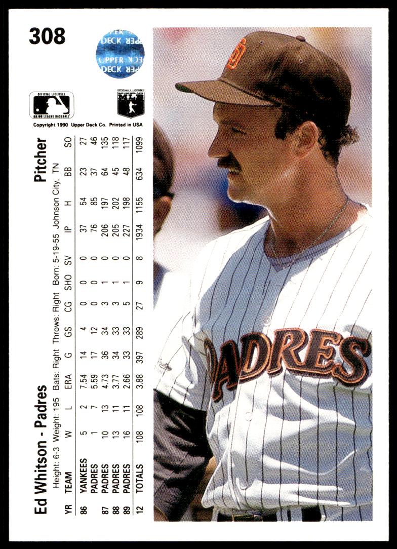 This Baseball card, from 1990 is part of the Upper Deck  card set. Ed Whitson is featured and has a card number of 308.