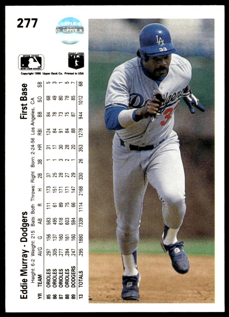 This Baseball card, from 1990 is part of the Upper Deck  card set. Eddie Murray is featured and has a card number of 277.