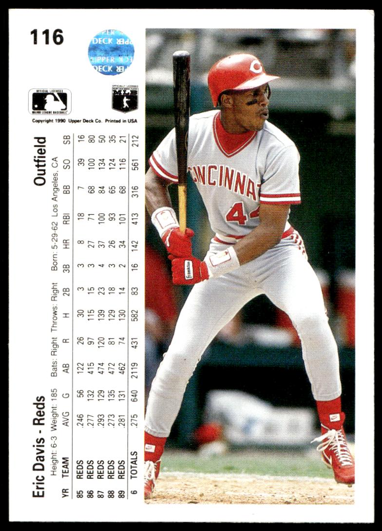 This Baseball card, from 1990 is part of the Upper Deck  card set. Eric Davis is featured and has a card number of 116.