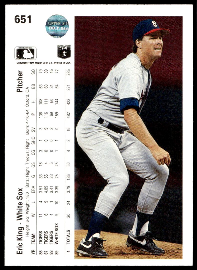 This Baseball card, from 1990 is part of the Upper Deck  card set. Eric King is featured and has a card number of 651.