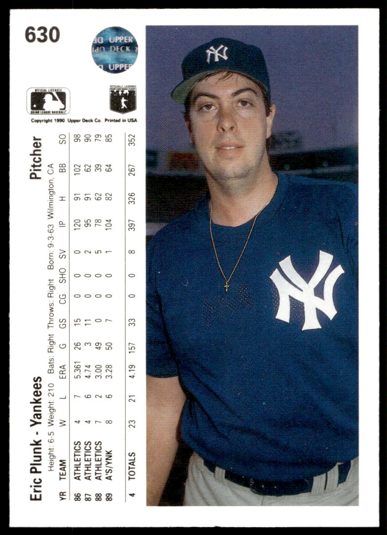 This Baseball card, from 1990 is part of the Upper Deck  card set. Eric Plunk is featured and has a card number of 630.