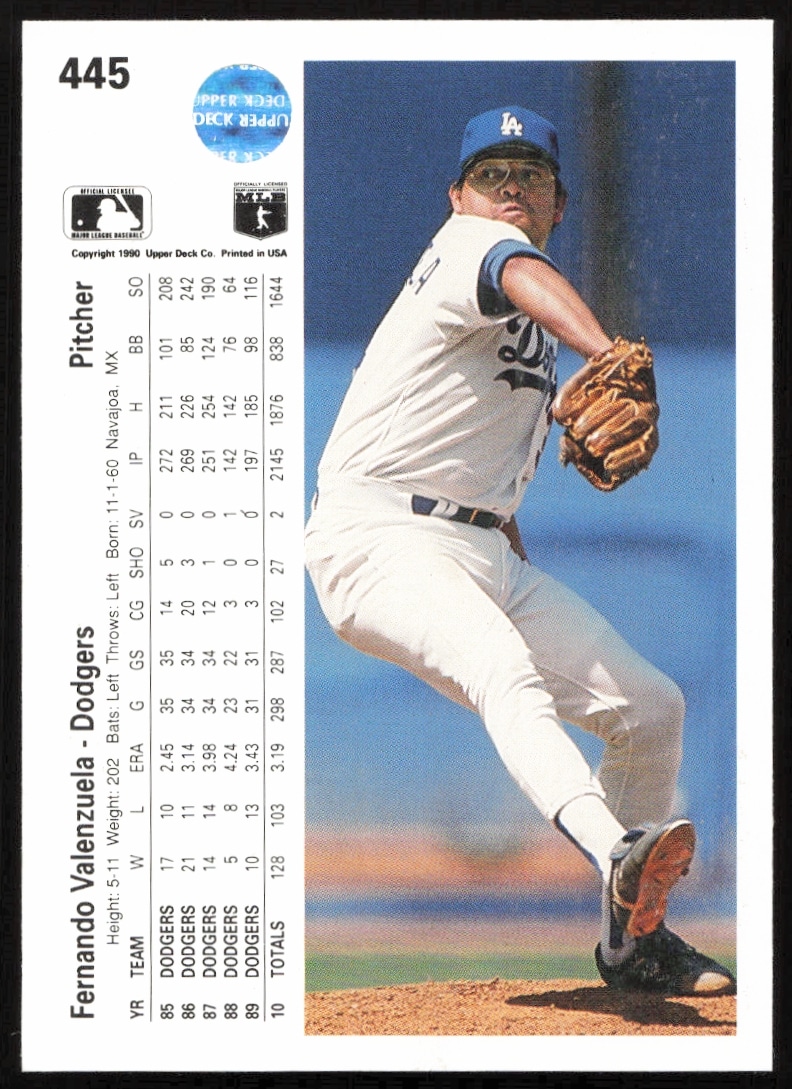 This Baseball card, from 1990 is part of the Upper Deck card set. Fernando Valenzuela is featured and has a card number of 445.