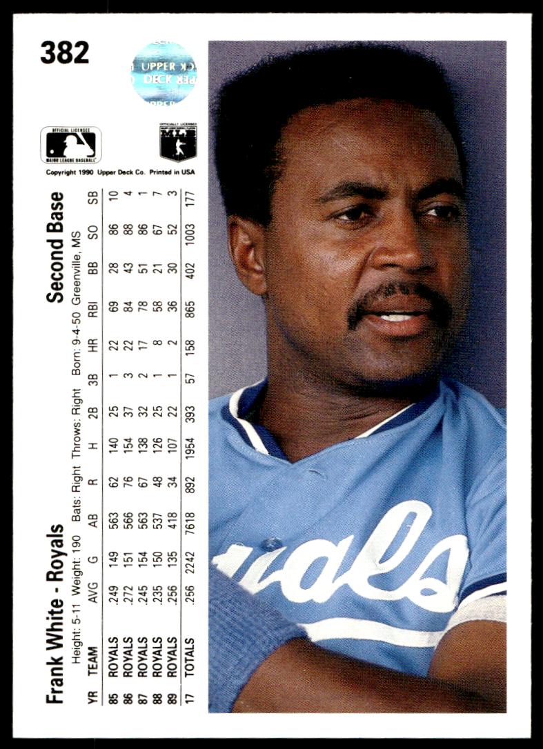 This Baseball card, from 1990 is part of the Upper Deck  card set. Frank White is featured and has a card number of 382.