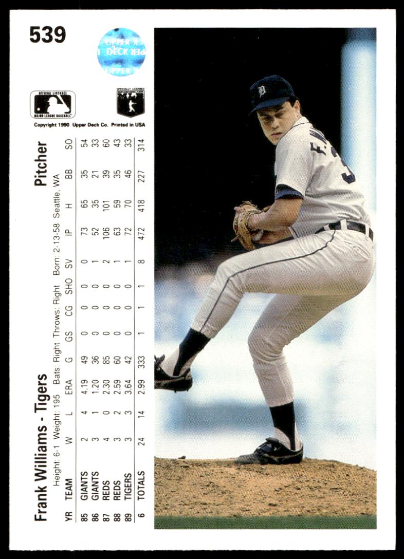 This BaseballΒ card, from 1990 is part of the Upper Deck Β card set. Frank Williams is featured and has a card number of 539.