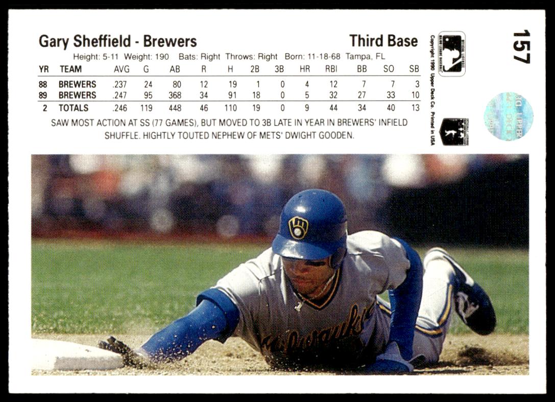 This Baseball card, from 1990 is part of the Upper Deck  card set. Gary Sheffield is featured and has a card number of 157.