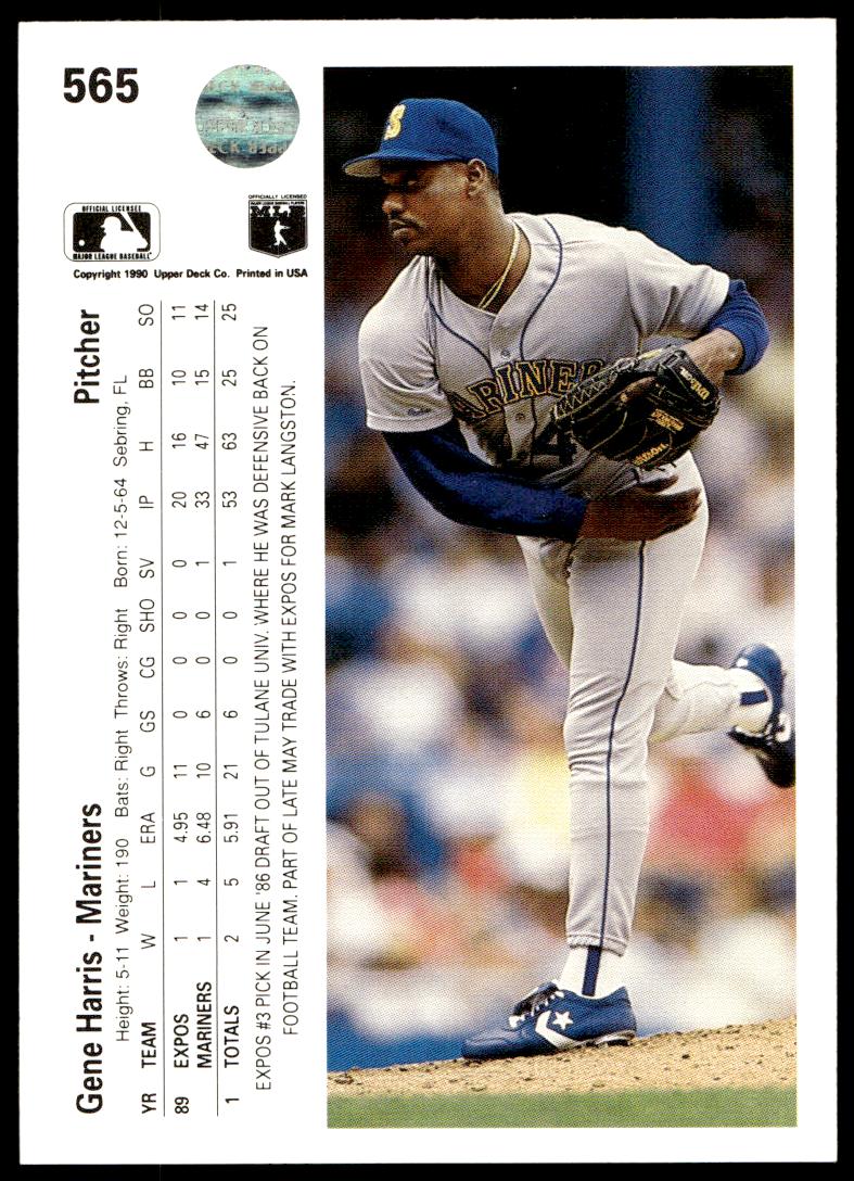 This Baseball card, from 1990 is part of the Upper Deck  card set. Gene Harris is featured and has a card number of 565.