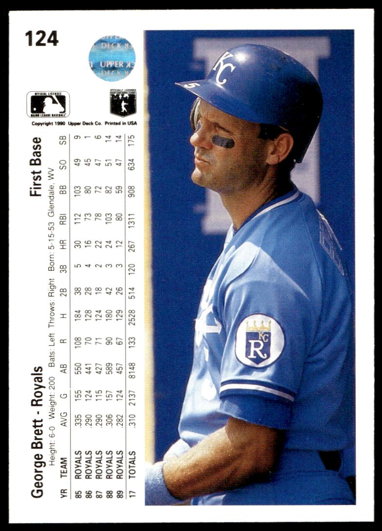 This Baseball card, from 1990 is part of the Upper Deck  card set. George Brett is featured and has a card number of 124.