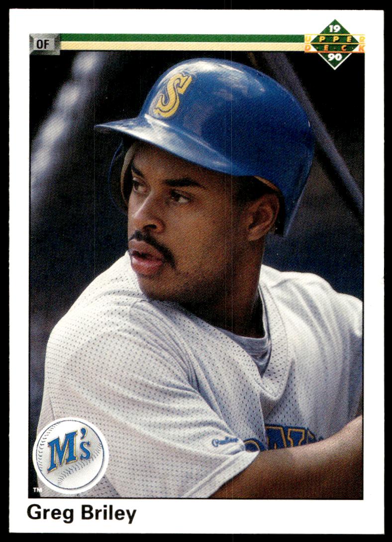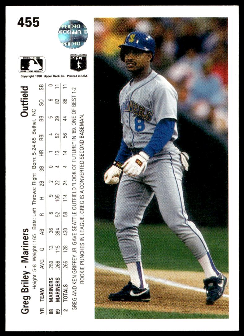 This Baseball card, from 1990 is part of the Upper Deck  card set. Greg Briley is featured and has a card number of 455.