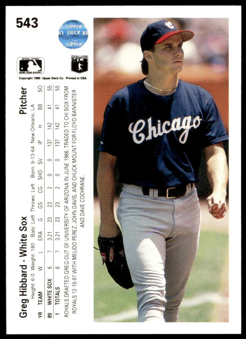 This Baseball card, from 1990 is part of the Upper Deck  card set. Greg Hibbard is featured and has a card number of 543.