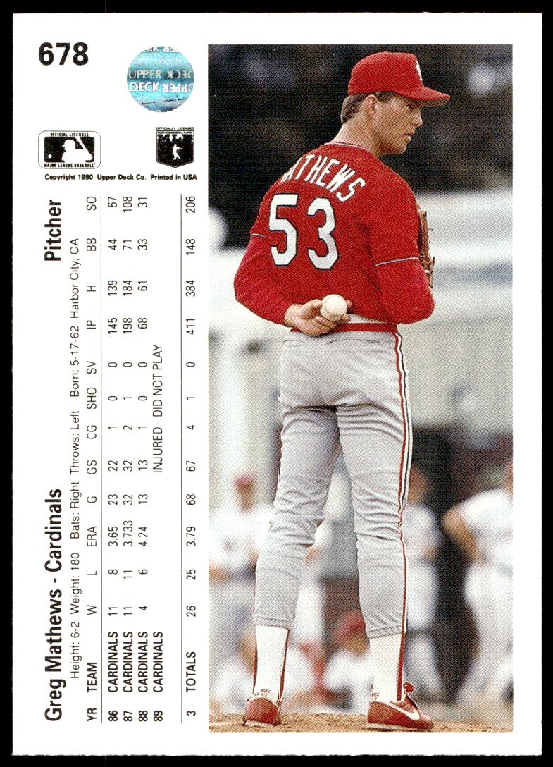 This Baseball card, from 1990 is part of the Upper Deck  card set. Greg Mathews is featured and has a card number of 678.