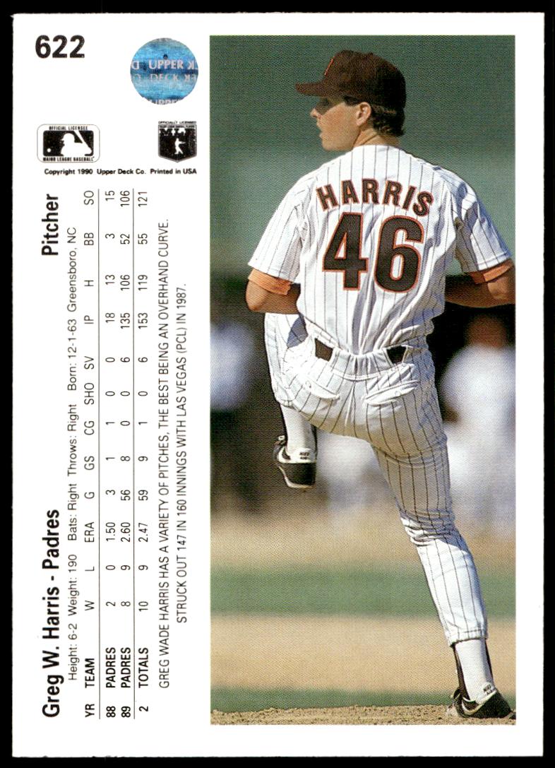 This BaseballΒ card, from 1990 is part of the Upper Deck Β card set. Greg W. Harris is featured and has a card number of 622.