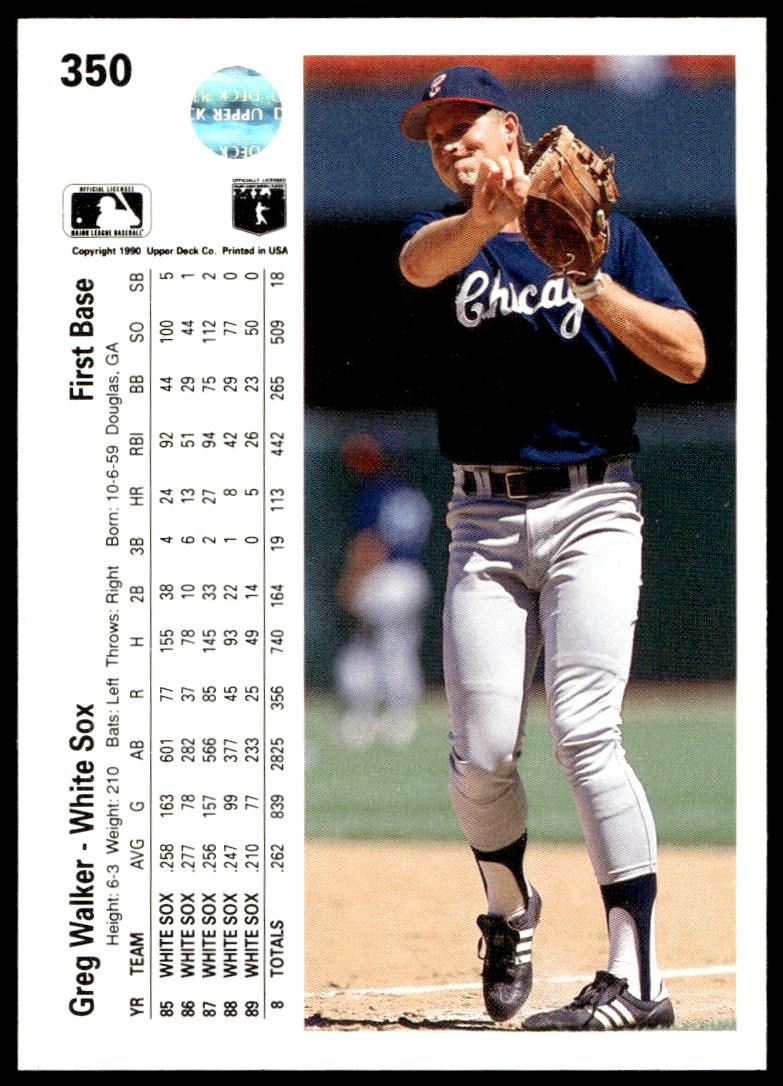 This Baseball card, from 1990 is part of the Upper Deck  card set. Greg Walker is featured and has a card number of 350.