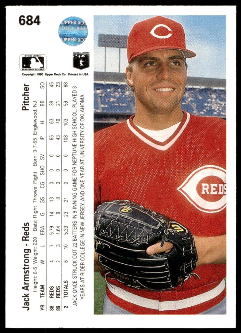 This BaseballΒ card, from 1990 is part of the Upper Deck Β card set. Jack Armstrong is featured and has a card number of 684.