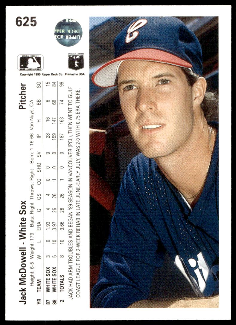 This BaseballΒ card, from 1990 is part of the Upper Deck Β card set. Jack McDowell is featured and has a card number of 625.