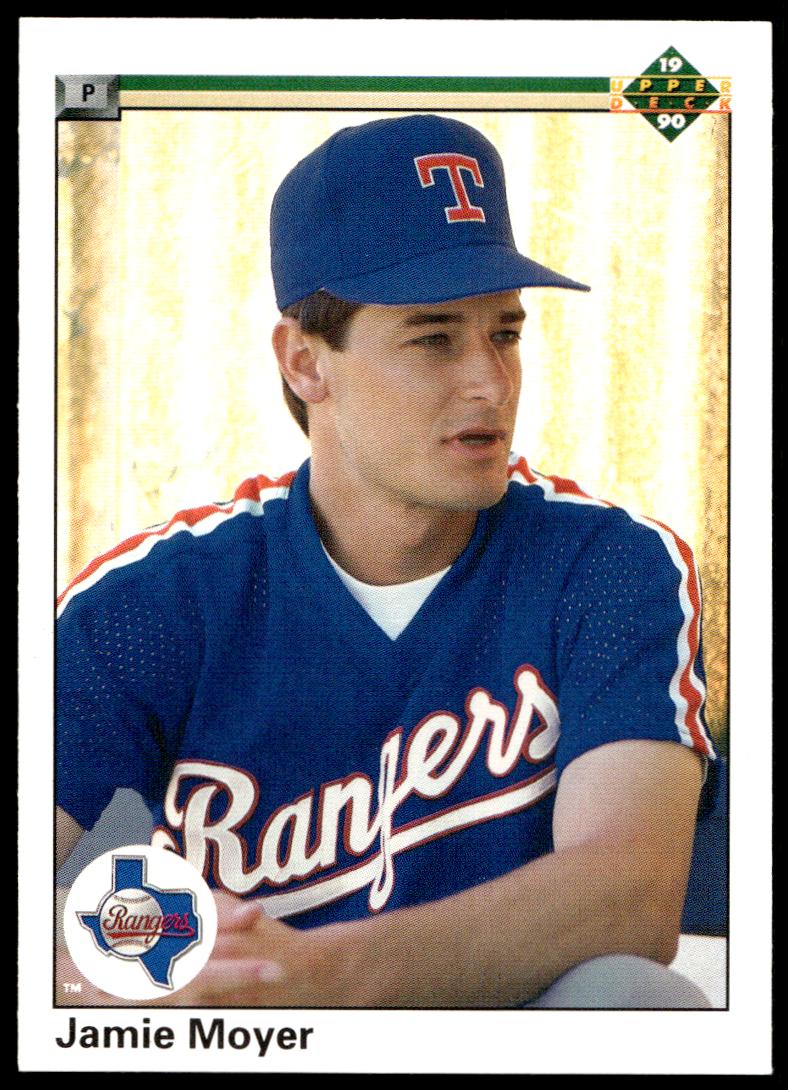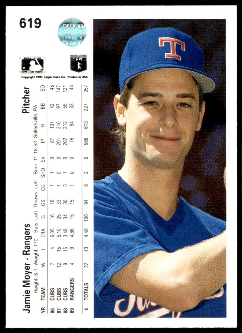This Baseball card, from 1990 is part of the Upper Deck  card set. Jamie Moyer is featured and has a card number of 619.