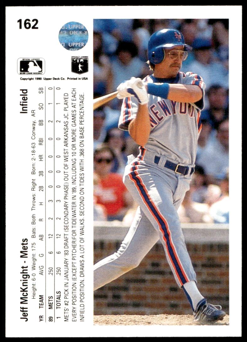 This Baseball card, from 1990 is part of the Upper Deck  card set. Jeff McKnight is featured and has a card number of 162.