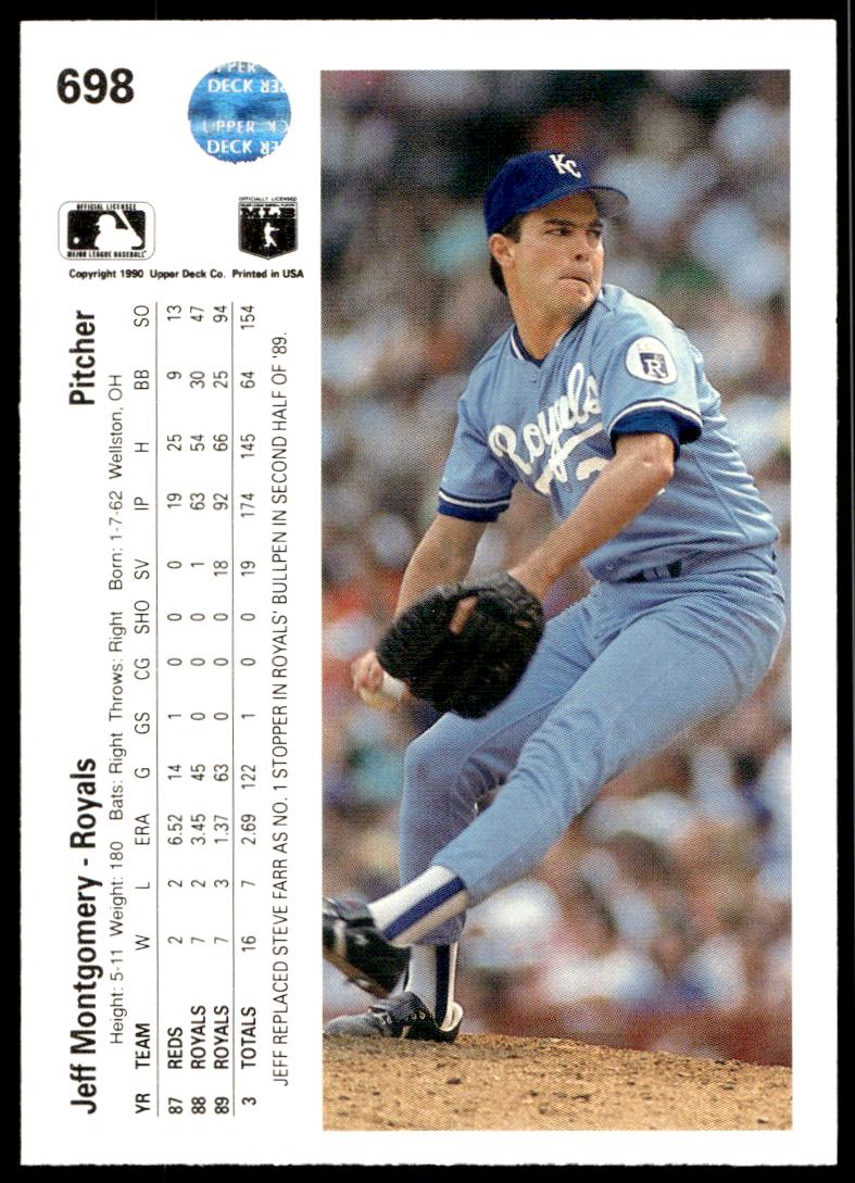 This Baseball card, from 1990 is part of the Upper Deck  card set. Jeff Montgomery is featured and has a card number of 698.