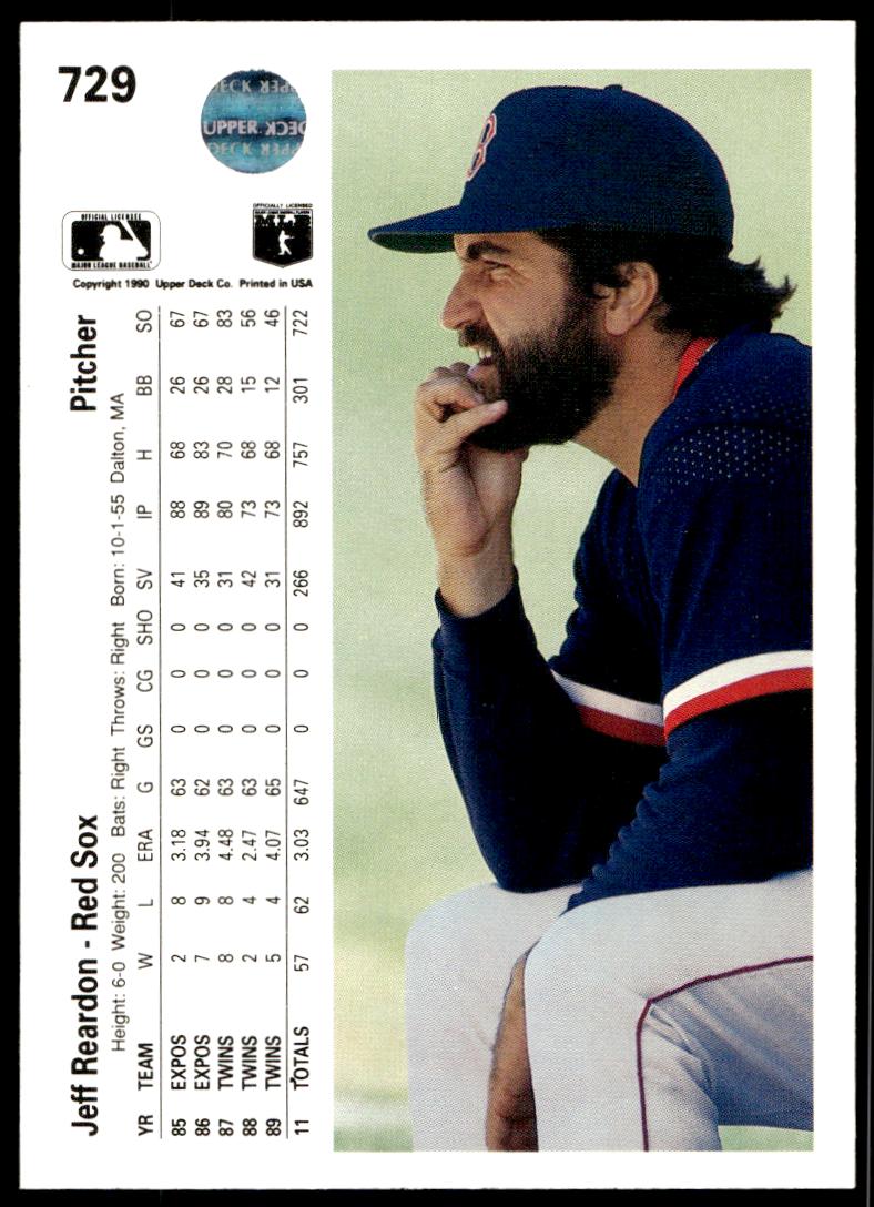This Baseball card, from 1990 is part of the Upper Deck  card set. Jeff Reardon is featured and has a card number of 729.