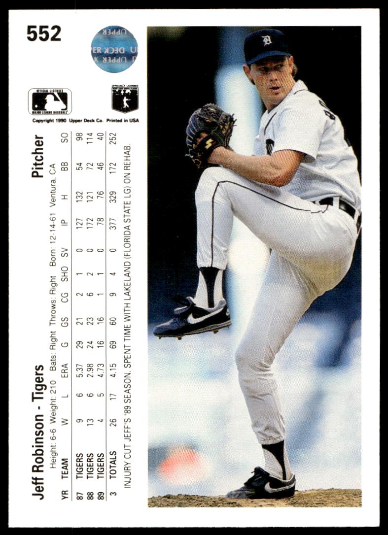 This BaseballΒ card, from 1990 is part of the Upper Deck Β card set. Jeff Robinson is featured and has a card number of 552.