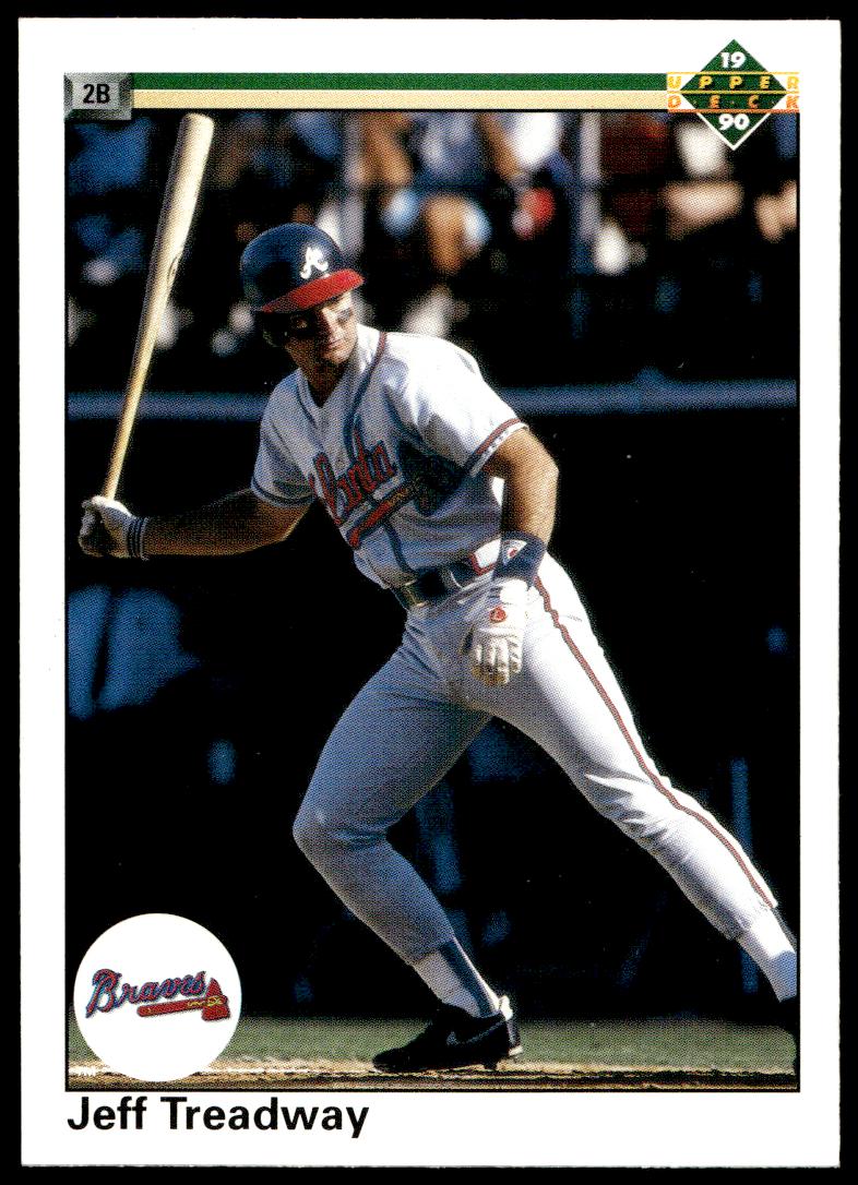 This BaseballΒ card, from 1990 is part of the Upper Deck Β card set. Jeff Treadway is featured and has a card number of 141.