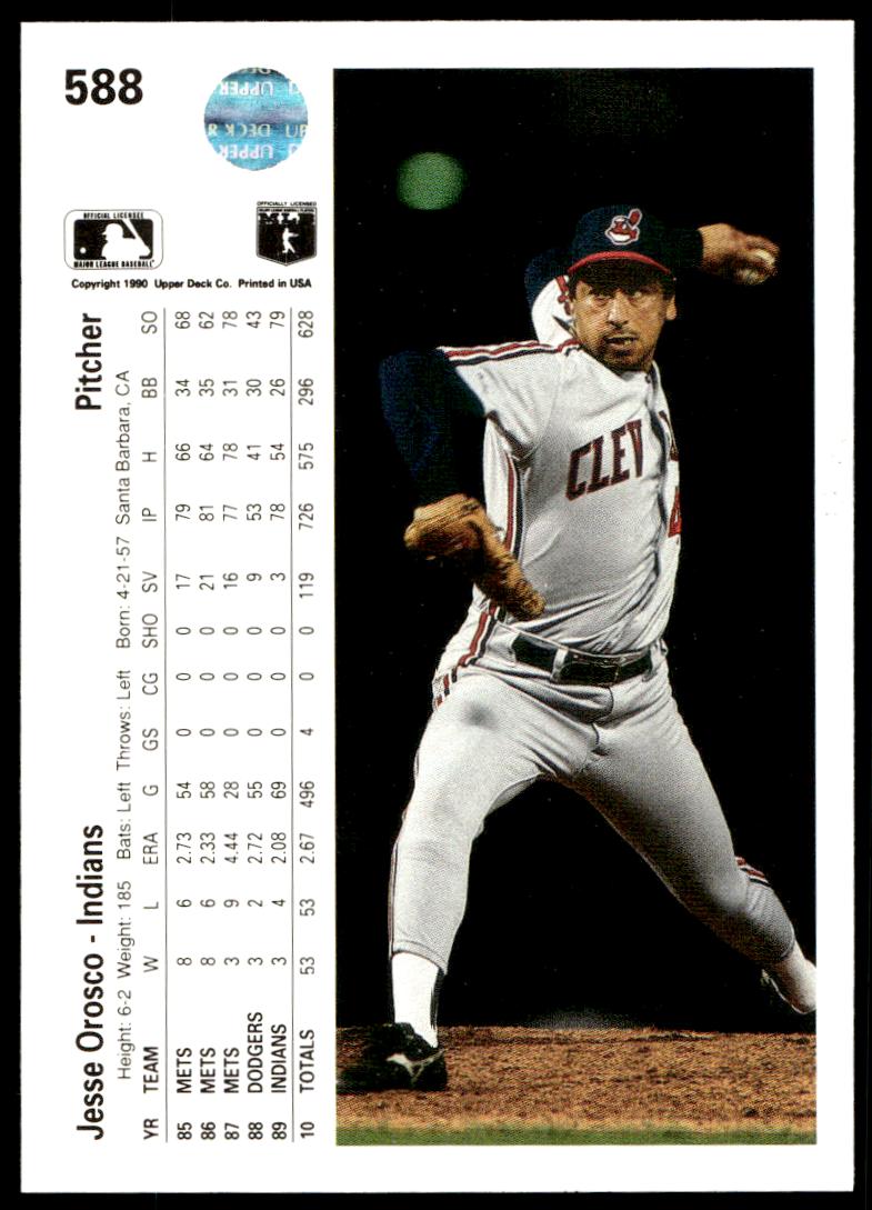 This Baseball card, from 1990 is part of the Upper Deck  card set. Jesse Orosco is featured and has a card number of 588.