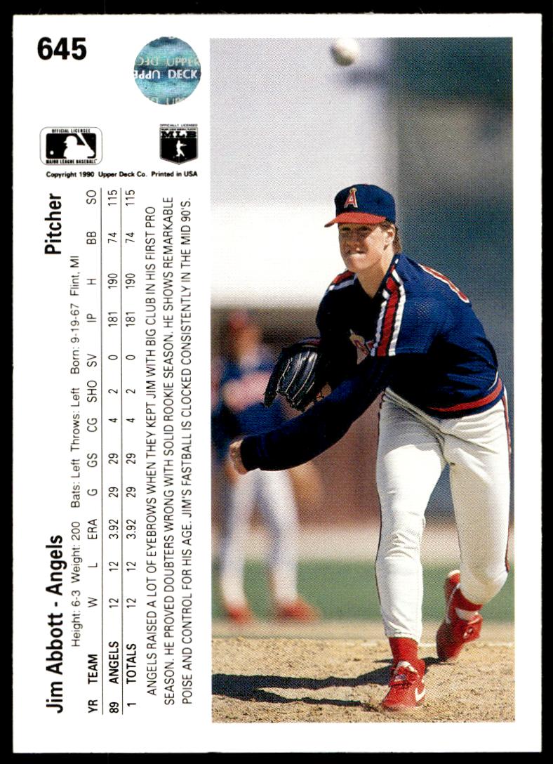 This Baseball card, from 1990 is part of the Upper Deck  card set. Jim Abbott is featured and has a card number of 645.