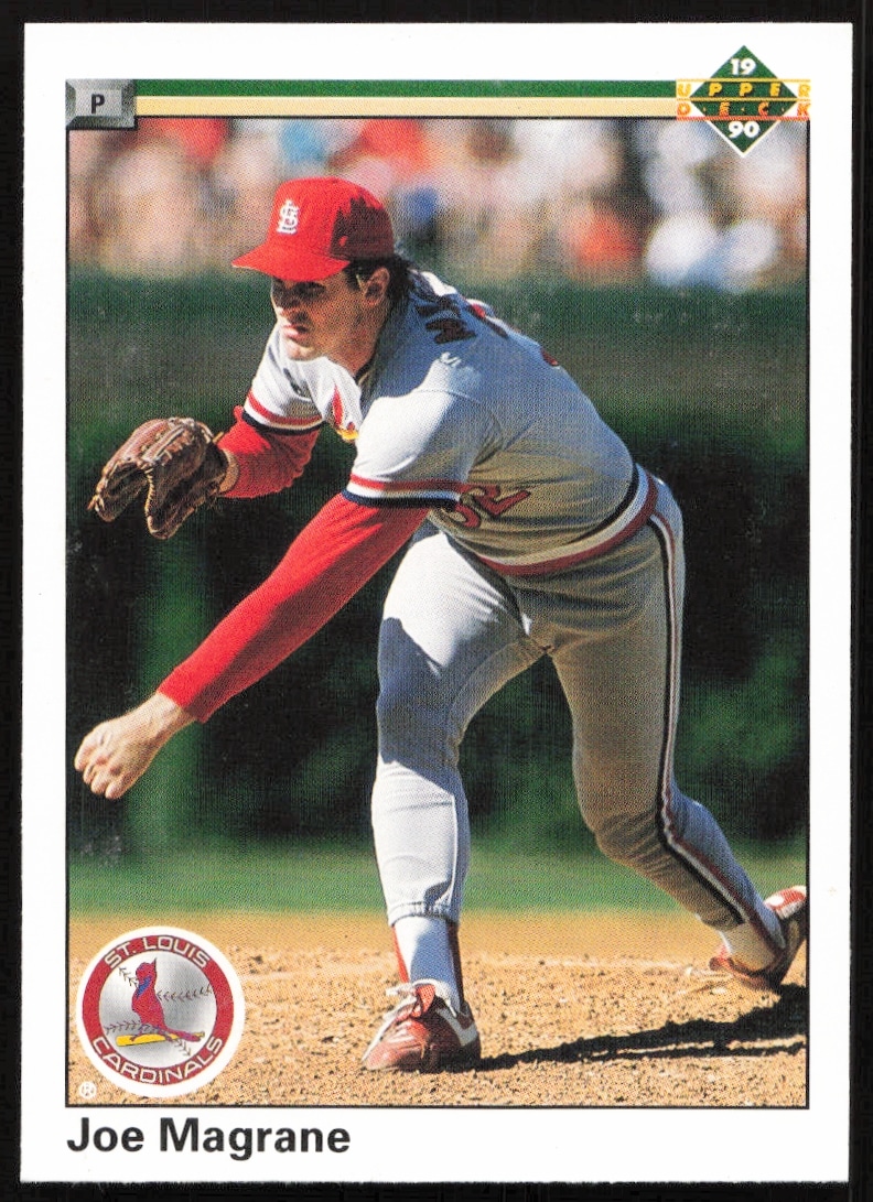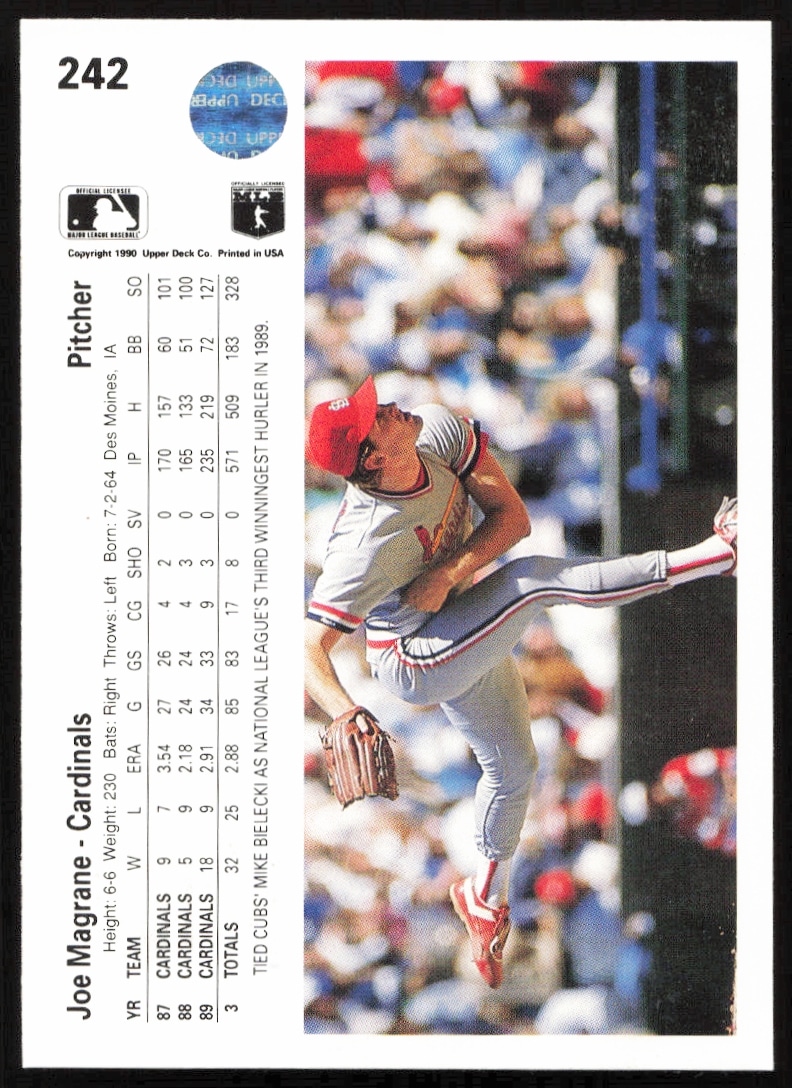 This Baseball card, from 1990 is part of the Upper Deck card set. Joe Magrane is featured and has a card number of 242.