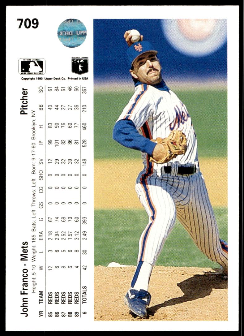 This Baseball card, from 1990 is part of the Upper Deck  card set. John Franco is featured and has a card number of 709.