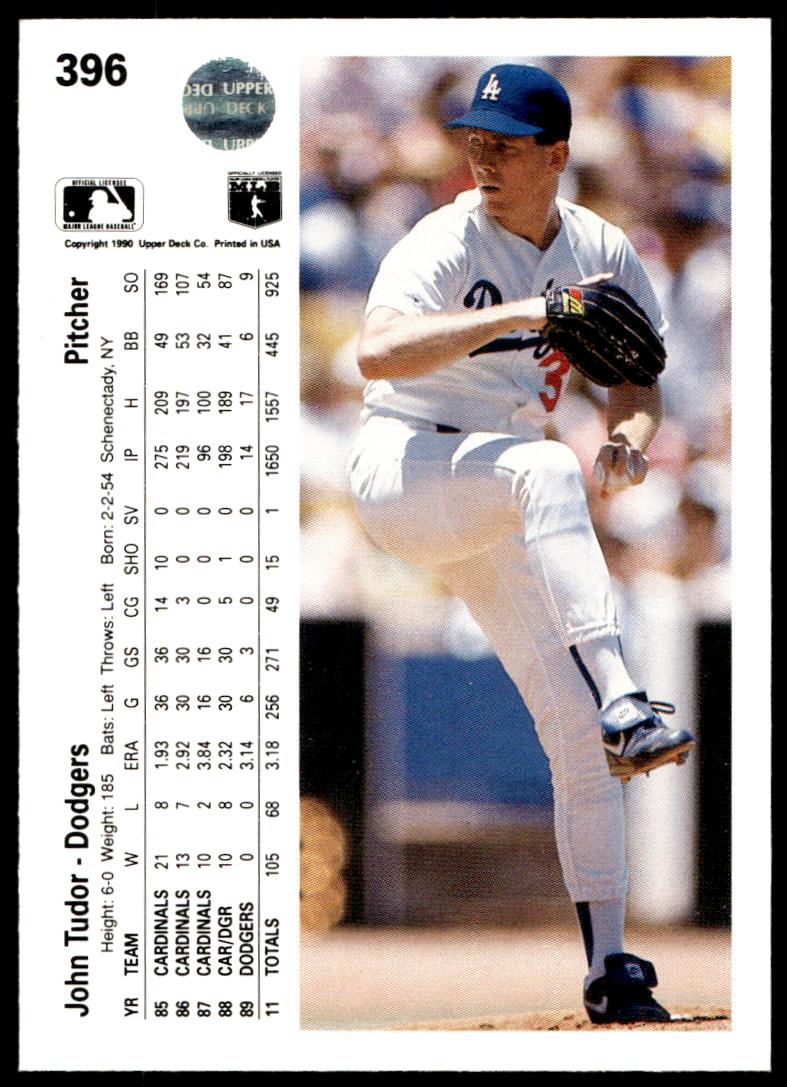 This Baseball card, from 1990 is part of the Upper Deck  card set. John Tudor is featured and has a card number of 396.