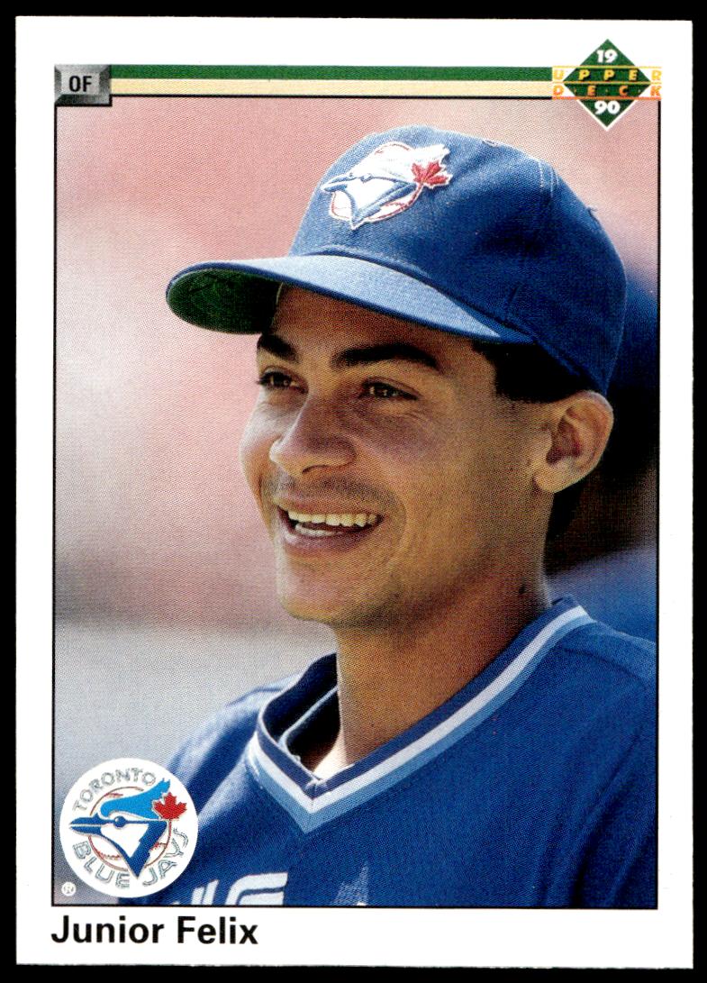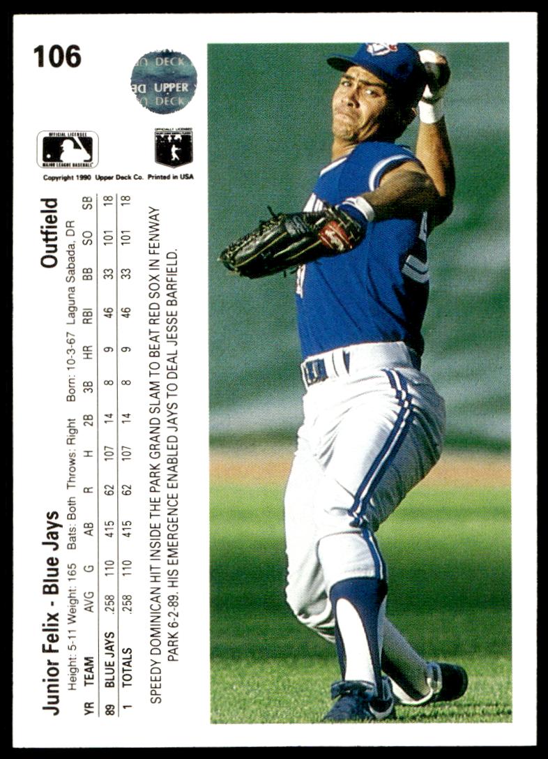 This Baseball card, from 1990 is part of the Upper Deck  card set. Junior Felix is featured and has a card number of 106.