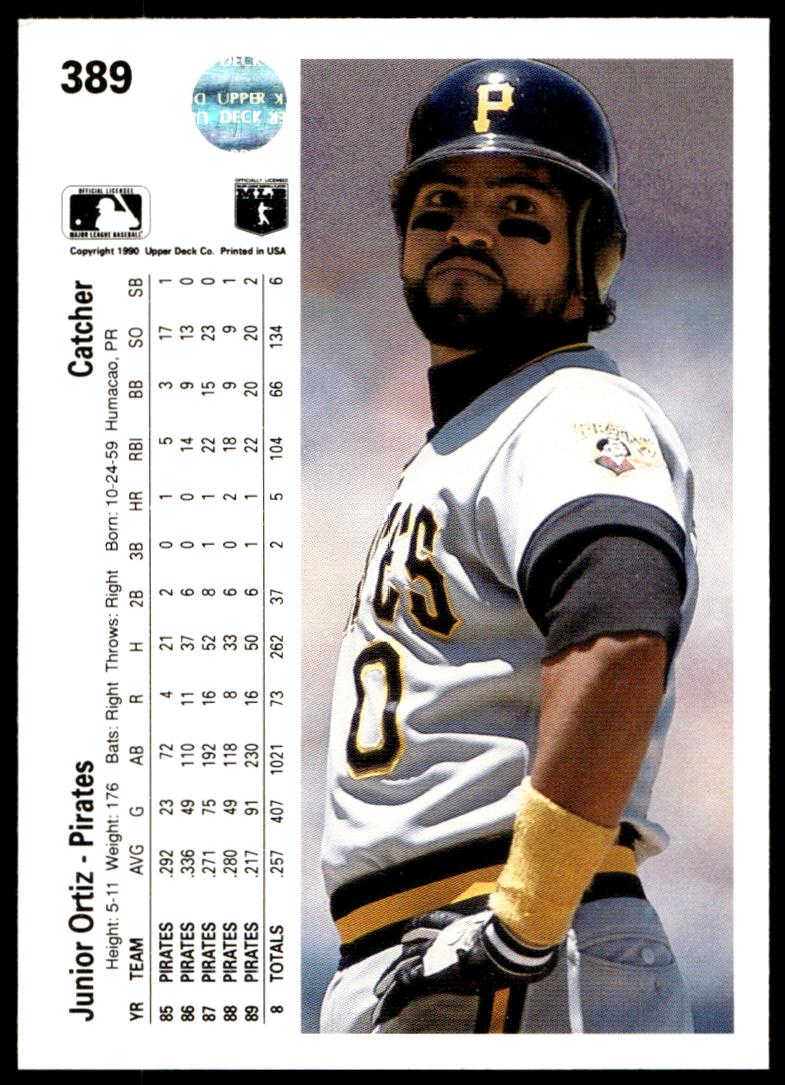 This Baseball card, from 1990 is part of the Upper Deck  card set. Junior Ortiz is featured and has a card number of 389.