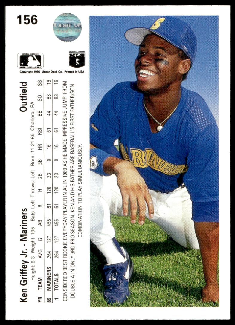 This Baseball card, from 1990 is part of the Upper Deck  card set. Ken Griffey Jr. is featured and has a card number of 156.
