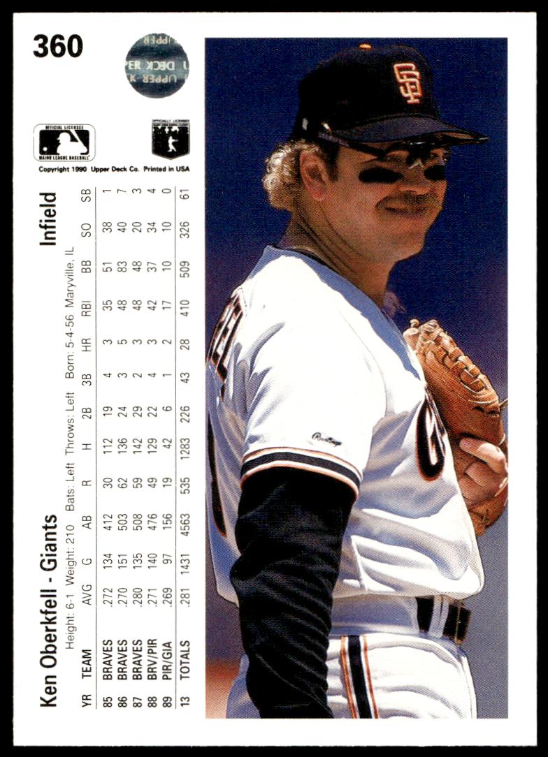 This Baseball card, from 1990 is part of the Upper Deck  card set. Ken Oberkfell is featured and has a card number of 360.