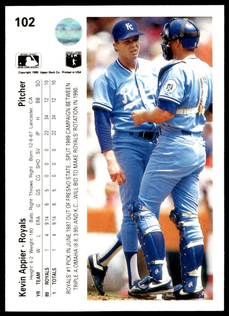 This Baseball card, from 1990 is part of the Upper Deck  card set. Kevin Appier is featured and has a card number of 102.