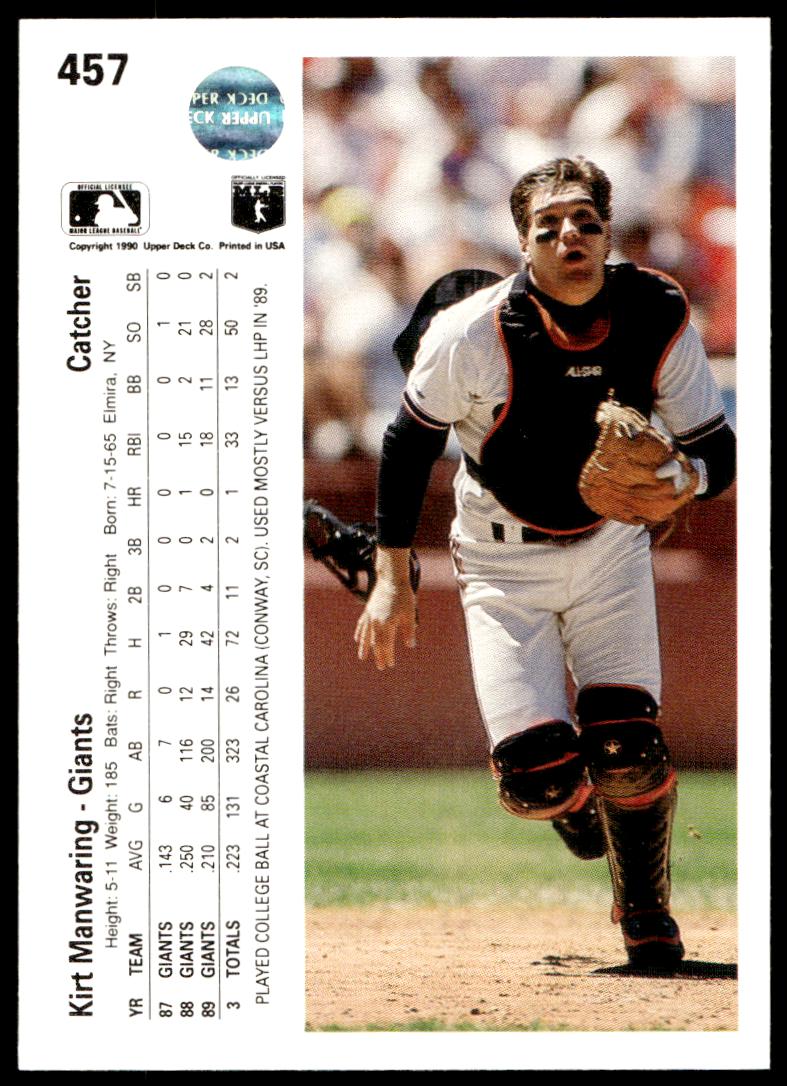 This BaseballΒ card, from 1990 is part of the Upper Deck Β card set. Kirt Manwaring is featured and has a card number of 457.