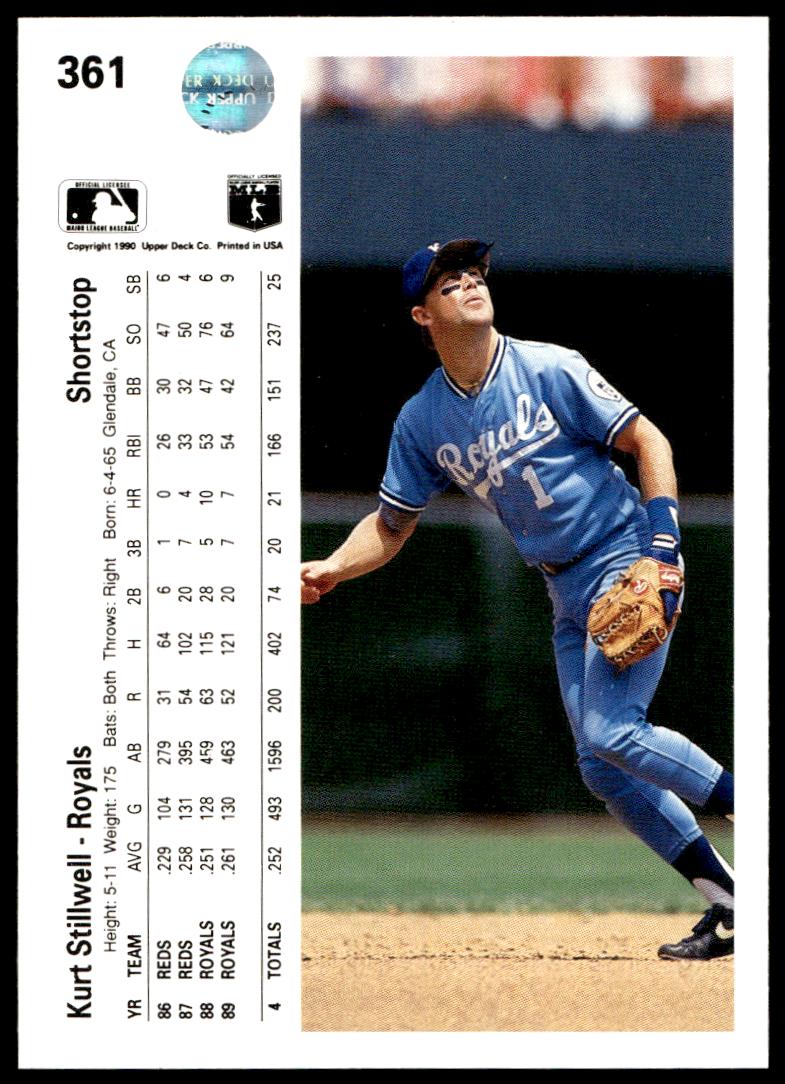 This BaseballΒ card, from 1990 is part of the Upper Deck Β card set. Kurt Stillwell is featured and has a card number of 361.