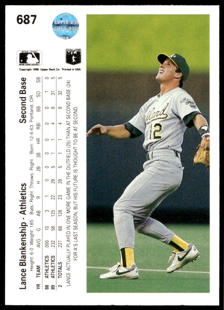 This BaseballΒ card, from 1990 is part of the Upper Deck Β card set. Lance Blankenship is featured and has a card number of 687.