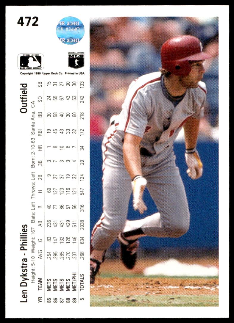 This Baseball card, from 1990 is part of the Upper Deck  card set. Len Dykstra is featured and has a card number of 472.
