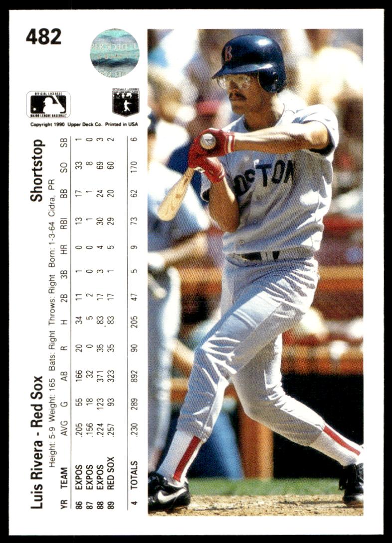 This Baseball card, from 1990 is part of the Upper Deck  card set. Luis Rivera is featured and has a card number of 482.