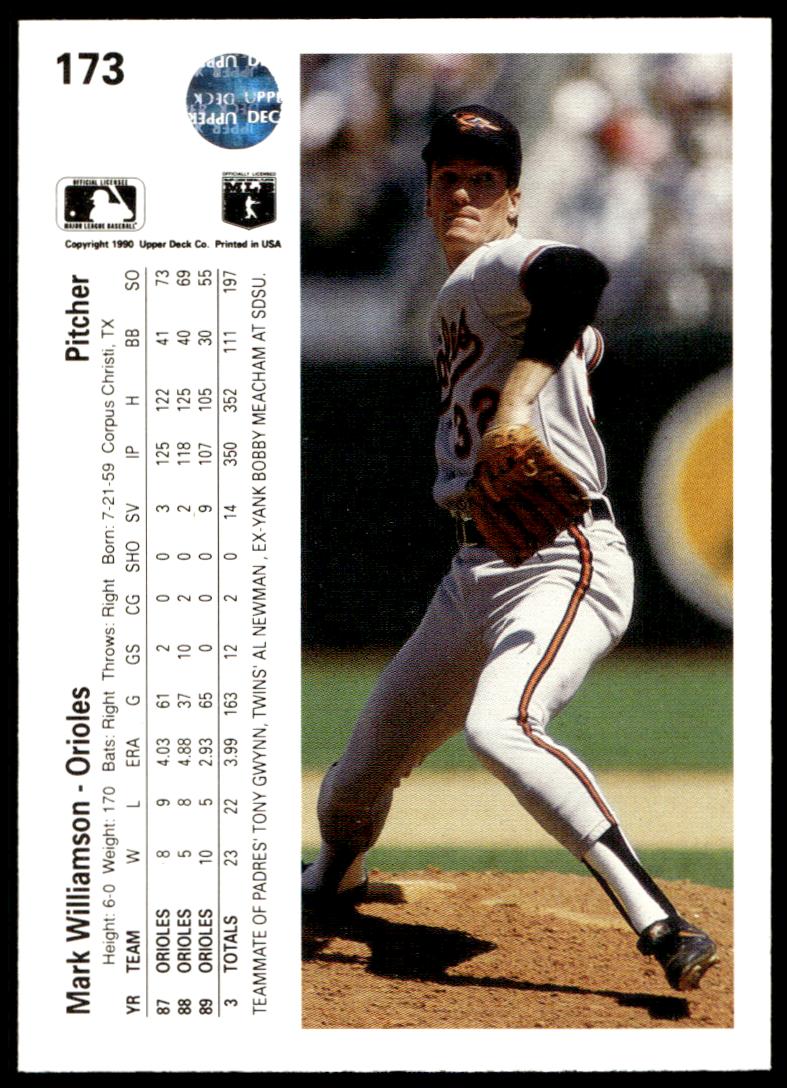 This BaseballΒ card, from 1990 is part of the Upper Deck Β card set. Mark Williamson is featured and has a card number of 173.