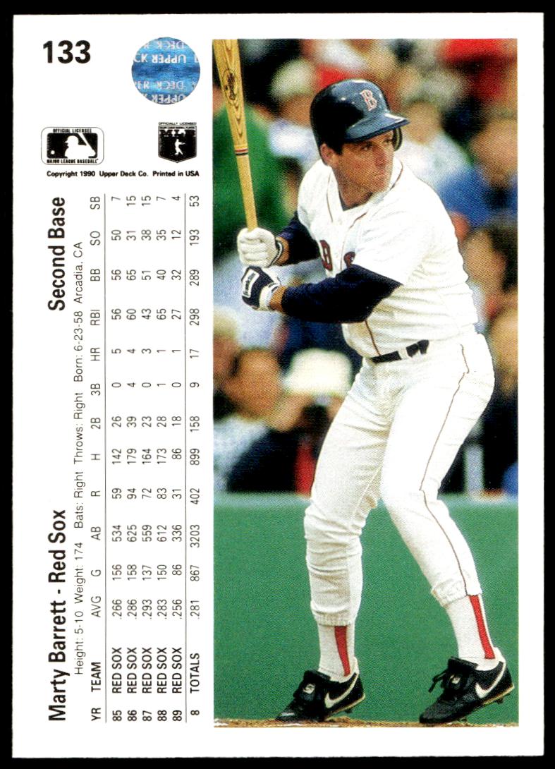 This BaseballΒ card, from 1990 is part of the Upper Deck Β card set. Marty Barrett is featured and has a card number of 133.