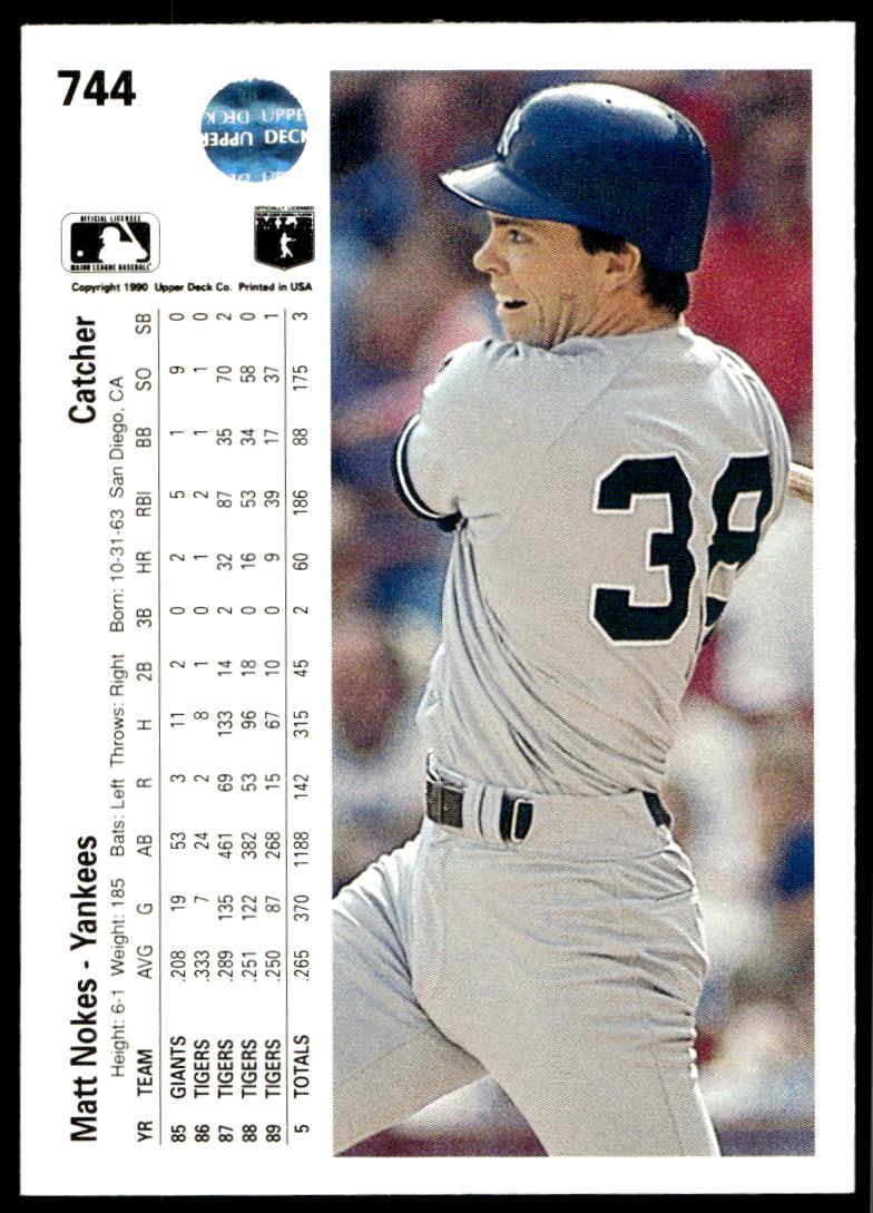 This Baseball card, from 1990 is part of the Upper Deck  card set. Matt Nokes is featured and has a card number of 744.