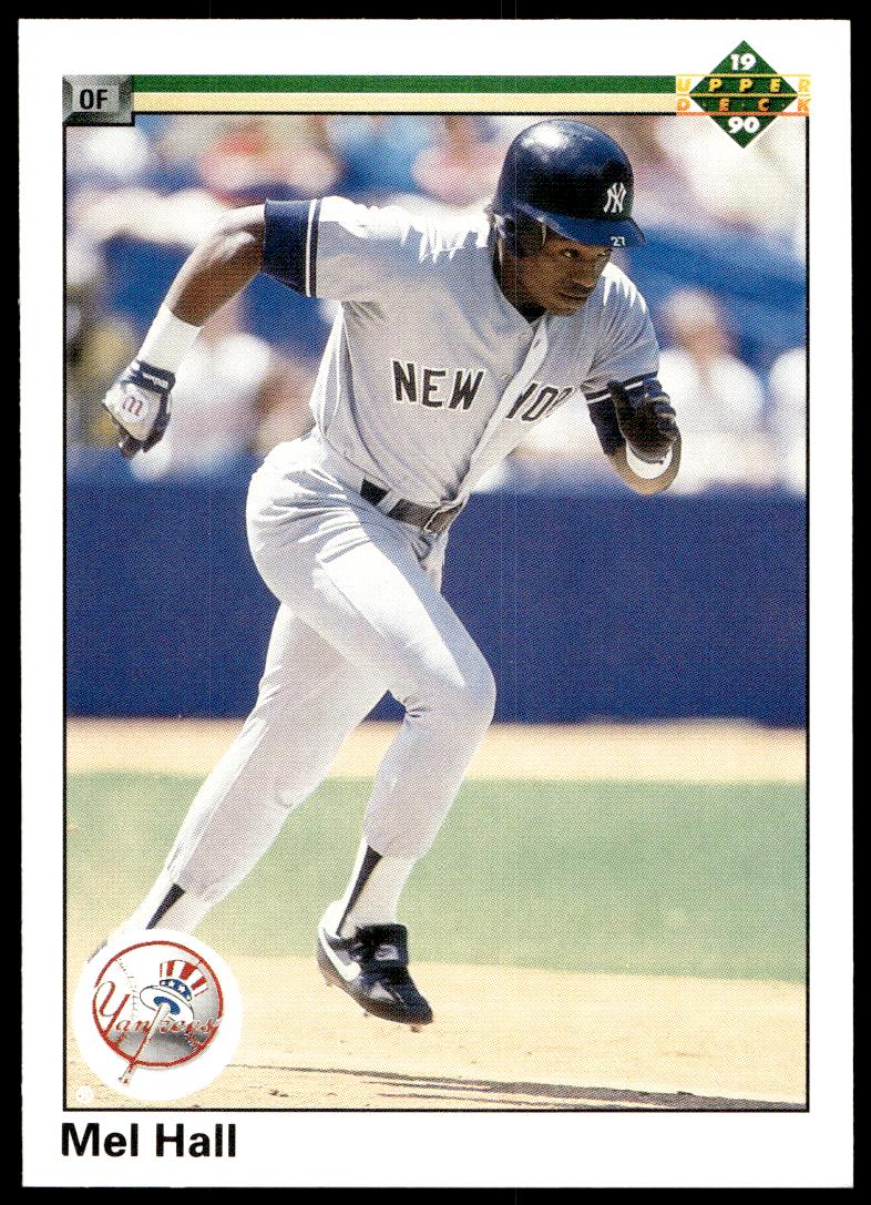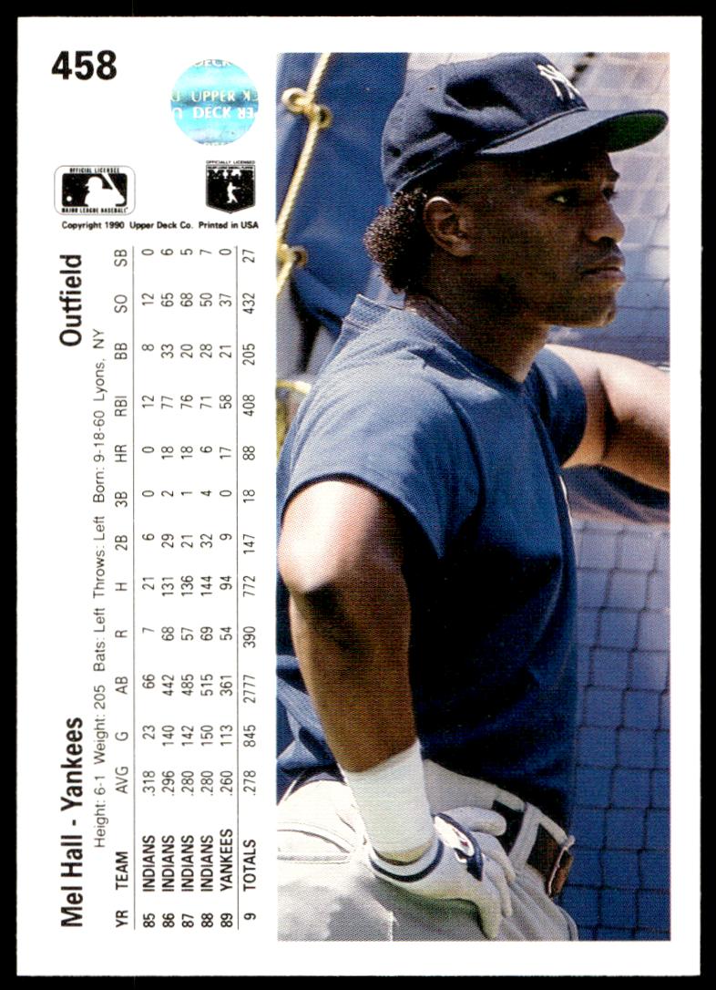 This Baseball card, from 1990 is part of the Upper Deck  card set. Mel Hall is featured and has a card number of 458.